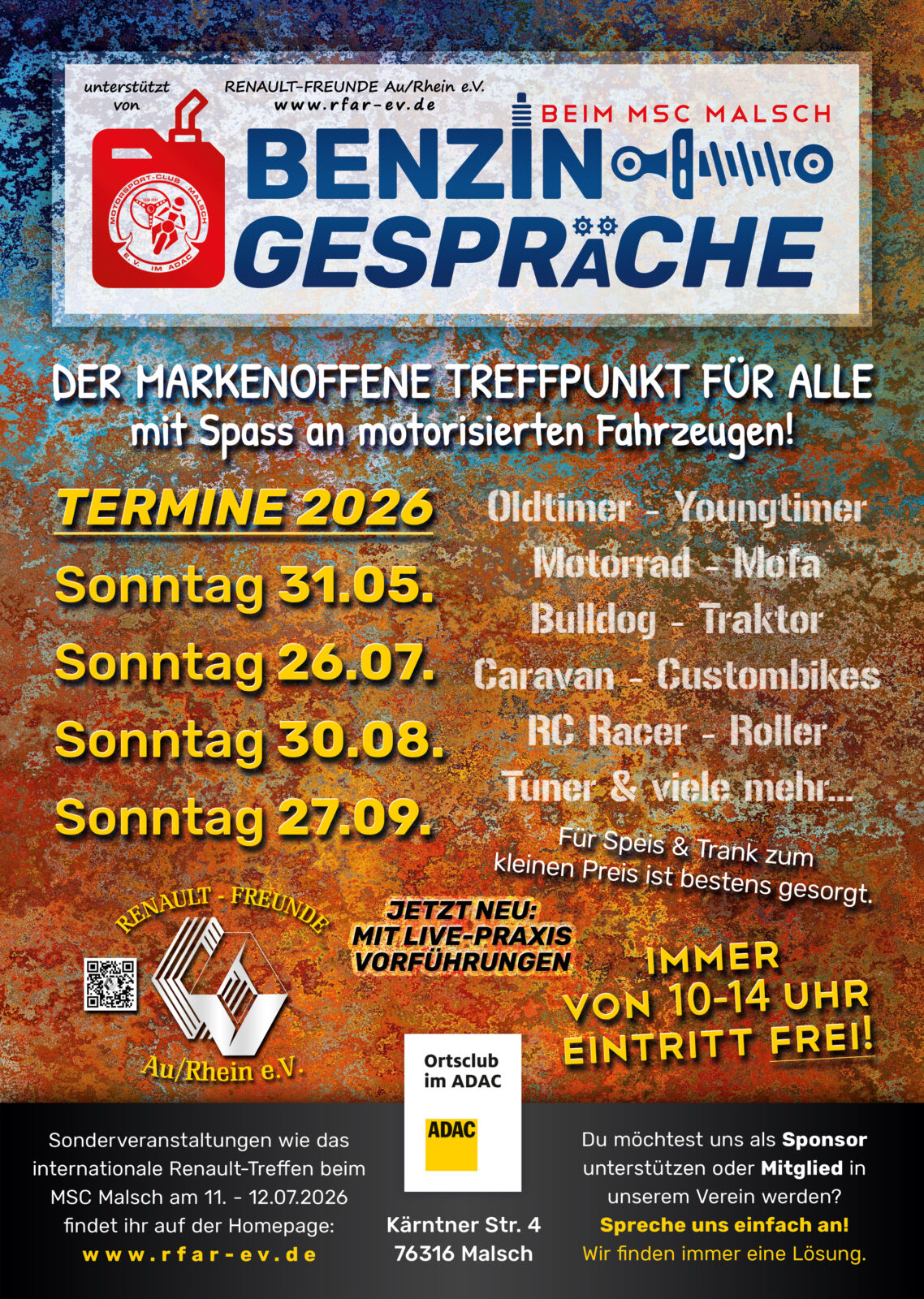 Wir freuen uns gemeinsam mit den Renault-Freunde Au/Rhein e. V. unsere Benzingespräche auch in diesem Jahr weiter zu führen.