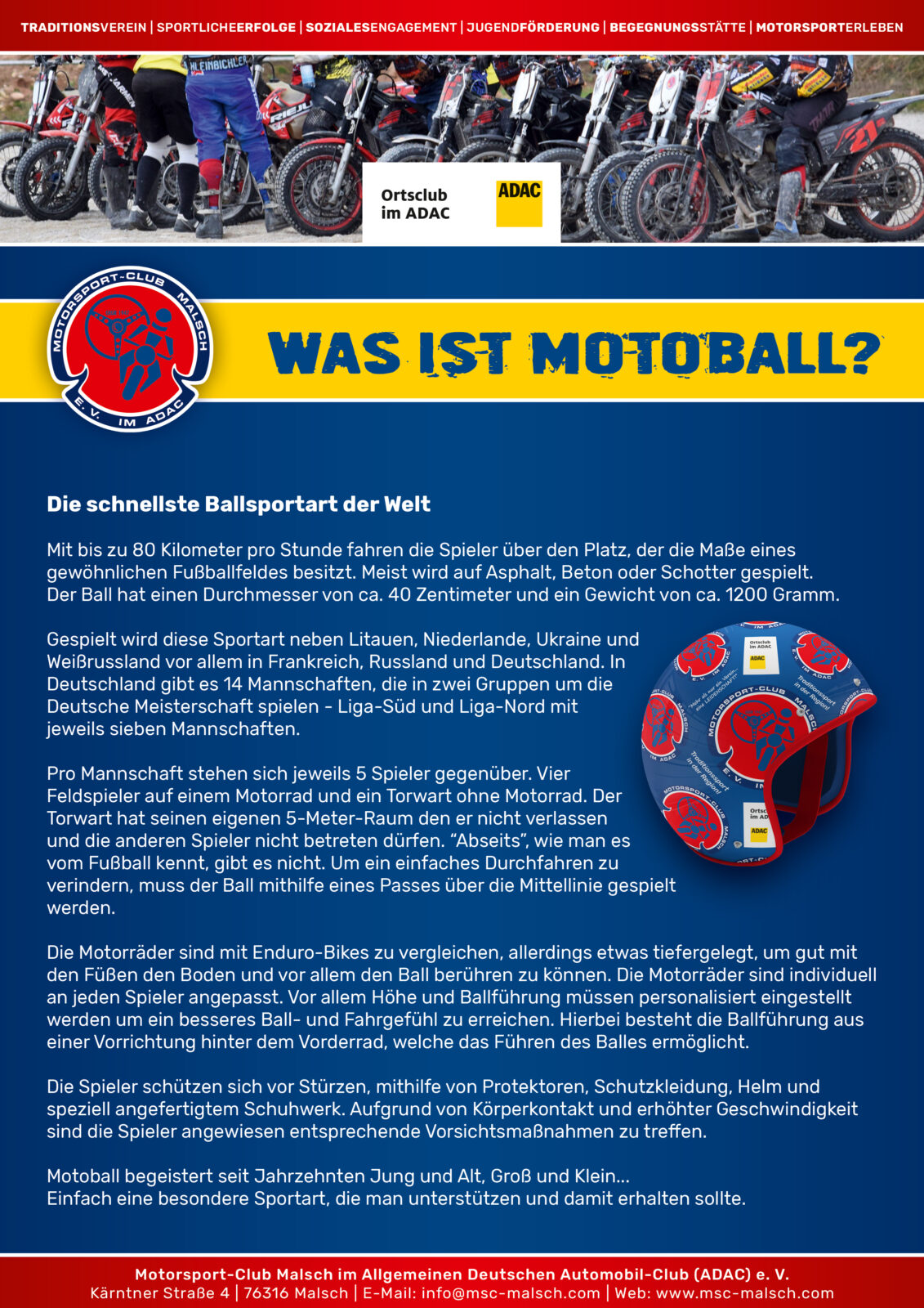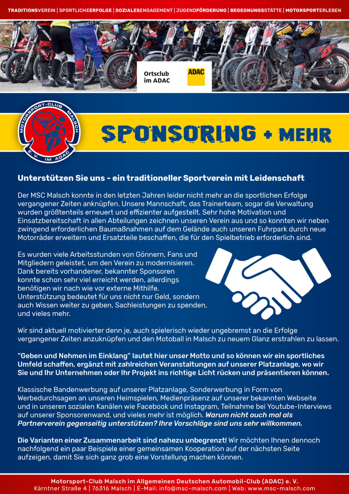 Wir sind als ein flexibler Traditionsverein und seit 1947 ein Ortsbestandteil von Malsch bei Karlsruhe. Wir sind immer stehts daran interessiert, nicht nur den Motoball-Sport nach vorne zu bringen oder unsere Mitglieder zu fördern und unseren Verein mit Leidenschaft zu leben, sondern freuen uns natürlich auch über Ihre Unterstützung jeglicher Art. Wir haben zwar eine Sponsorenmappe, aber es gibt sehr viele weitere Möglichkeiten, wie Sie unseren Verein unter die Arme greifen können. Sprechen Sie uns einfach an.